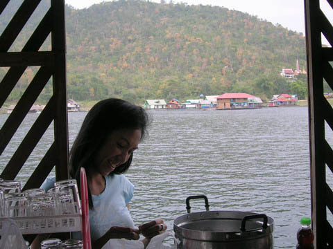 อืมมม .. ภาพนี้ .. หลายคนชมว่า .. สวย !! .... .. .... หลังจากเย็นย่ำ .. ก็เข้าสู่เวลาค่ำคืน .. ( หรือใครจะเถียง ?? ) เรื่องราวในภาคค่ำนี้ .. ไม่ขอกล่าวถึง .. เพราะไม่มีอะไรจะเล่า .. ก็แค่นั่งดื่มด่ำบรรยากาศ .. ร้องเพลง .. เล่นกีตาร์ .. ชิมรสชาติน้ำผลไม้ .. มีคนไข้ขึ้นเพราะเสียเบ็ด .. ซัดพารา ฯ ไป 2 เม็ด หลับตั้งแต่ 2 ทุ่ม .. อีกคนก็ถูกมนต์ขลังของเขื่อนศรี ฯ .. หนีไปตั้งแต่ก่อน 3 ทุ่ม .. เรียกหา .. ไม่ขานรับ .. แปลกแต่จริง .. น้ำผลไม้ .. ทำให้คนนอนหลับเป็นตายวุ้ย !! อีกบางคน .. นั่งบ่นงึมงำ ๆ .. สักพักก็เดินหนีไปดื้อ ๆ .. แล้วก็หายเงียบไปอีกคน .. 3 คน 3 มุม .. ทิ้งผู้หญิงสีม่วงไว้คนเดียวง่ะ .. เพิ่งอาบน้ำมา .. ยังไม่ถึง 3 ทุ่มด้วย .. ง่วงซะที่ไหน .. แต่ทำไงได้ .. ก็ต้องไปเข้ามุมของตัวเอง .. ข่มตานอน .. และเรื่องราวหลังจากนั้นก็สงบ .. ราบเรียบดั่งผืนน้ำ. กลางดึกคืนนั้นเอง .. จู่ ๆ ก็มีเสียงราดน้ำดัง .. ซู่ ๆๆๆ .. เหมือนฝนตกห่าใหญ่ .. ตอนแรกเข้าใจว่า .. มีคนขี้ร้อนลุกมาอาบน้ำตอนดึก ๆ .. มารู้เอาทีหลังว่า .. ใครบางคน .. คลื่นลมในกระเพาะตีกลับ .. อาเจียนเล็กน้อยถึงปานกลาง .. เลยลุกขึ้นมาล้างตัว .. กรำเจง ๆ .. อืมมมมม .. ..... .. ........ เช้าแระ .. ก๊าาา .. ก๊าาาา .. กาก้าาาาา .. กาก้าาาาาาา ผู้หญิงสีม่วง ถูกปลุกขึ้นมาด้วยเสียงนี้ .. เป็นเสียงที่ทราบในภายหลังว่า .. เป็นเพื่อนเก่าขอเจ๊กีกี้ .. มาร้องเรียกเจ๊นั่นเอง .. กาก้าาาา .. กาก้าาาา ... ( ก๊ากกกก .. ขำคนเดียวอ่ะ ) ลุกตื่นจากที่นอน .. เดินออกมารับแสงแดดยามเช้า .. ฉับพลันก็ต้องตกตะลึงกับภาพที่ได้เห็น .. พระมาบิณฑบาตรถึงที่แพ .. โอ้แม่เจ้า !! แต่ .. พอดูให้ชัด ๆ .. อ้อ .. ไม่ใช่พระ .. ทั่นเดาอังคันนั่นเอง ..