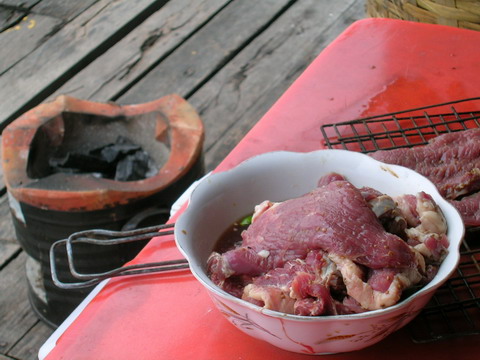 พ่อครัวหย่ายยยของเรา .. ฝากชีวิตไว้กับเขาแล้ว .. ขอเล่านิดนึง .. ตอนแรกน้าเรรวนตั้งใจว่าจะไม่ซื้อเนื้อสัตว์ใด ๆ ไปให้เปลืองตังค์ .. เป็นการประหยัดเพื่อให้สมชื่อทริปนี้ .. ที่เราแอบเรียกกันว่า .. ทริปคนจน .. น้าบอกว่า .. เราจะไปกินปลาสด ๆ กัน .. ปลาที่ตกได้นี่แหละ .. อร่อยนัก .. ซื้อแต่เครื่องแกง กับเครื่องต้มยำไป .. แต่โชคดีเหลือเกิน .. ที่มีคนอยากกินเนื้อย่าง .. น้าก็เลยซื้อเนื้อติดไปด้วย .. ไม่งั้นละก็ ............ ( ติดตามกันต่อไป )